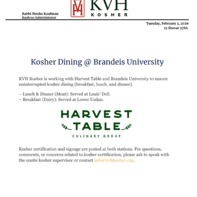 Information from KVH on supervision while the Kosher Table at Sherman is closed. Link to announcement from KVH – Kosher Dining @ Brandeis University • KVHKosher KVH Kosher is working with Harvest Table and Brandeis University to ensure uninterrupted…